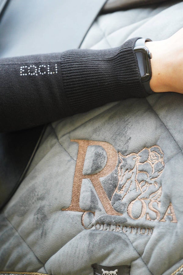 Mooie getailleerde V hals trui van het merk EQCLI - Equestrian Clothing. Deze trui in de kleur zwart is afgemaakt met strass steentjes in de kleur zwart. De versieringen zijn geplaatst op de mouw en op de voorkant van de trui.